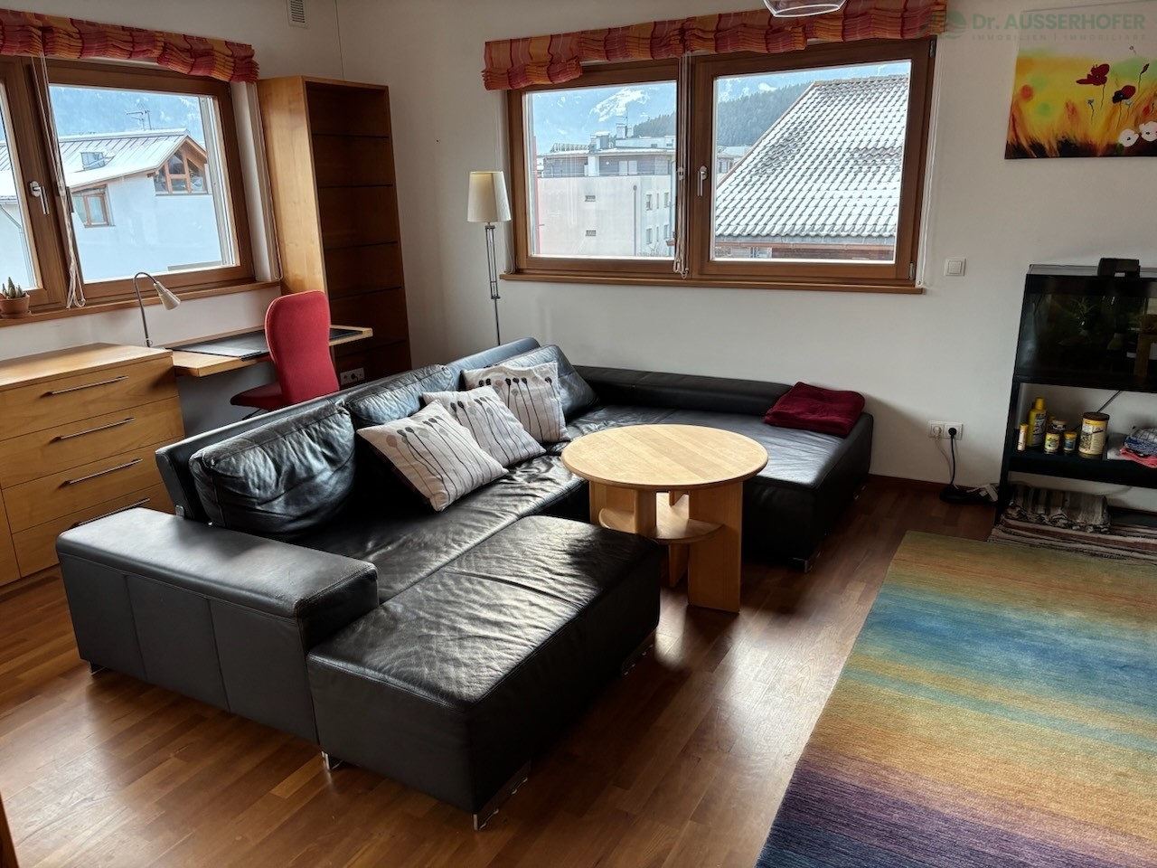 Großzügige, konventionierte Dachgeschosswohnung in einem Privathaus in ruhiger, sonniger Lage in Stegen mit freiem Blick auf den Kronplatz, ca. 104 m², bestehend aus einem großen Wohnraum mit Küche und Essplatz, Speise, zwei Schlafzimmern und einer Loggia. Bis auf ein Bett im zweiten Schlafzimmer ist die Wohnung komplett möbliert. Die Wohnung ist mit Fußbodenheizung und einer Umlauftanlage sowie einer zentralen Staubsaugeranlage ausgestattet. Ein Parkplatz steht direkt vor dem Haus zur Verfügung. Kondominiumsspesen: ca. 600/Jahr.